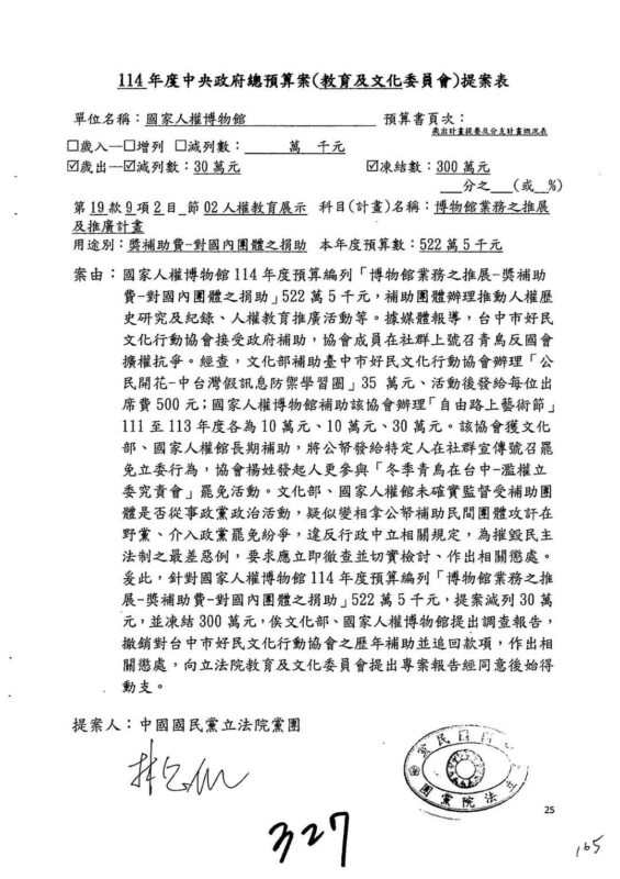 國家人權博物館補助該協會(好民文化行動協會),辦理「自由路上藝術節」111-113年各為10萬元、10萬元與30萬元⋯⋯協會楊姓發起人更參與「冬季青年在台中-濫權立委究責會」罷免行動⋯⋯針對國家人權博物館114年預算編列「博物館業務之推展獎補助費對國內團體之捐助」522萬5千元,提案減列30萬元並凍結300萬元預算,俟文化部、國家人權博物館提出調查報告,撤銷對台中好民文化協會之歷年補助並追回款項,作出相關懲處,向立法院教育及文化委員會提出專案報告經同意後始得動支。