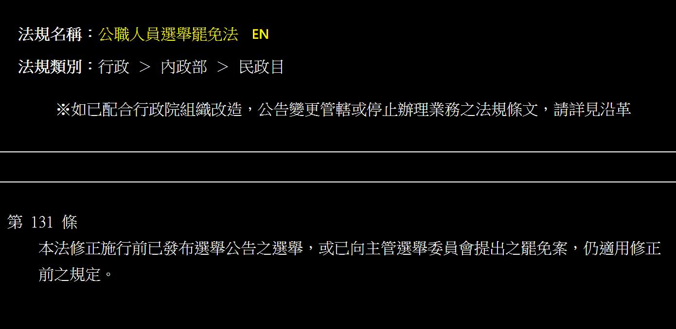 《公職人員選舉罷免法》第131條是2007年修訂的。對照其立法理由,就是「(選舉或罷免)比賽過程中,不可變更遊戲規則原則」。立法理由載明:「選舉包括:發布選舉公告、候選人登記、編造選舉人名冊、公告選舉人名冊、選舉活動、投票及開票及公告選舉結果等規定。罷免亦包括提議、連署、投開票等規定。常發生適用新法或舊法之爭議,尤其是如於辦理選舉、罷免期間適逢修法,而新舊法規定不同時,更是一大困擾,為避免發生同一種選舉、罷免部分適用舊法,另一部分適用新法情事,爰增列本條之規定。」