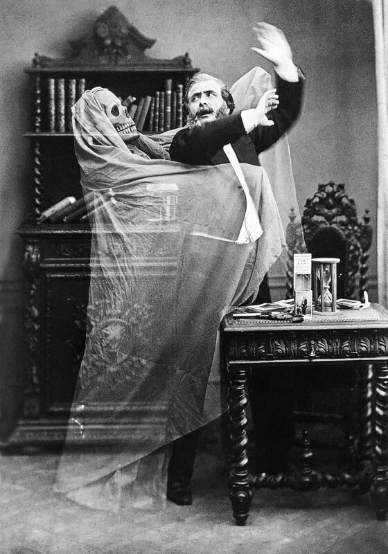 圖為1863年法國魔術師亨利.羅賓(Henri Robin)與鬼魂的雙重曝光照片,歐仁.提波(Eugène Thiébault)拍攝