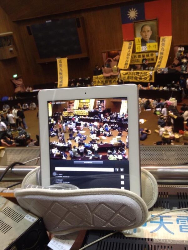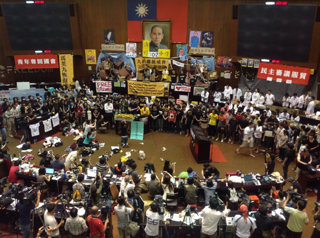 在民間壓力下,立法院同意審查協議。2014年3月17日立法院突然宣布通過服貿協議,引起巨大不滿。3月18日關心的民眾、老師、學生聚集於立法院外面,舉行抗議活動。當晚九時左右,民眾突然闖進立法院,佔據立法院議場,一直到4月10日才撤離。其間3月30日在凱道的集會據估計有數十萬人參加。