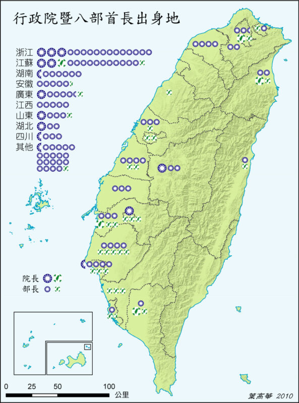 臺灣最主要的官僚體系:行政院及其所屬八部,究竟是由什麼地方出身的人來掌管呢?雖然每個人都懂得正經八百地說:「用人只問才能,不問出身。」沒錯,我完全不否認個人能力的重要,但現實的社會不是只有這樣而已。特別是行政院及其所屬八部的首長,既不是考試決定,也不是選舉決定,而是被任命的。那麼,什麼樣的人容易被任命為政務官,就與任命者的人脈大有關連了。不能輕忽的是,出身地正是形塑人脈的重要一環。