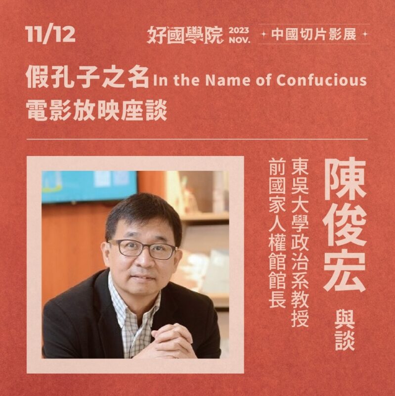 11/12(日)播放曾獲金勳章國際電影競賽人道主義特別獎的「假孔子之名」。此片關注中國政府花費數十億美元打造,曾在全美開設將近百間的漢語教學機構-「孔子學院」,然而「孔子學院」近來在國際上備受爭議,諸多歐美國家視其為中國的「大外宣機構」,使得孔子學院逐漸關閉,但與此同時孔子學院在中東與北非卻如雨後春筍般成長。「假孔子之名」便已漢語教師趙琪的視角,觀察他自身的宗教信仰如何被孔子學院明文禁止,並將親身經歷的人權歧視提起投訴,這最終導致麥克馬斯特大學最終關閉了孔子學院。本片邀請前國家人權館館長陳俊宏擔任與談,從其多年推動人權事務的視野出發,剖析文化滲透與人權之間的角力。