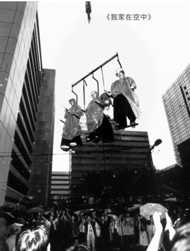 1994年,在颱風天,為了守護蔡瑞月老師的家,以及大家的舞蹈的家,我們三位,就在颱風天,24小時高吊行動。