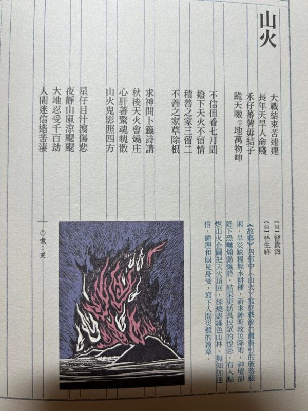 鍾理和文學音樂的計劃,啟動了曾醫師和我詞曲上的合作。當我第一次收到曾醫師的初稿,我竟不知所措,因為寫滿了一張A4紙的歌詞。我趕緊打電話給他,我說這一整張A4歌詞我鐵定背不起來,沒有辦法現場演出。我說可不可以請你用客家山歌的歌詞形式或者是童謠的格式,把你想要的歌詞寫出來?曾醫師很快的給了我回應。後來我們在「大地書房」專輯裡頭,合作了兩首曲子,一首是「山火」,一首是「細妹細妹跈我來」。