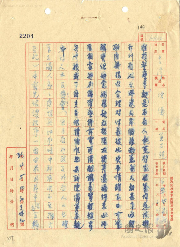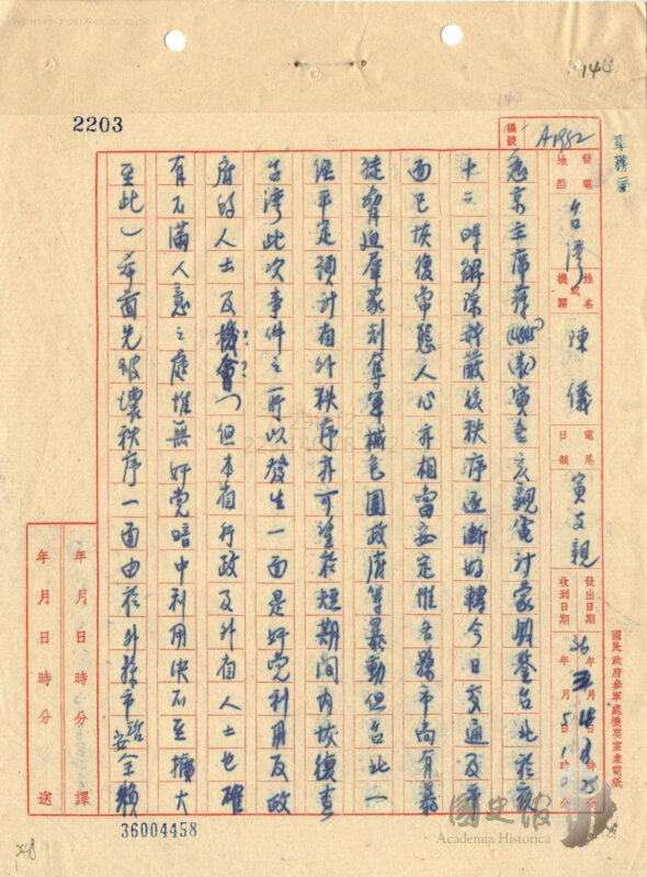 陳儀的「寅冬亥親電」,發出時間是3月2日的晚上九至十一時(即亥時),以無線電拍發。但這件電報陳儀是向蔣中正報告他已電請參謀總長陳誠「迅速酌調素質優良之步兵一旅,至少先派一團來台」。但這張向「鈞座」報告的電文,國民政府參軍處機要室是3月3日18時15分譯出,軍務局收文的時間是同日19時。3月3日軍務局人員就陳儀請求派兵一項,擬將本電報副張檢送陳總長,4日由軍務局人員擬將加上摘由紙連同原件呈閱,副局長毛景彪核閱後,便以局長俞濟時名義簽呈蔣中正。軍務局在擬辦意見另表示「原件呈閱。擬復悉並飭以後此類電報不可用無線電拍發」。蔣中正批示「如擬」。至於蔣批示的時間,從軍務局文電擬辦箋上「奉批如擬。中O。三五」的附註可知,蔣中正應是3月5日見到陳儀的「寅冬亥親電」。