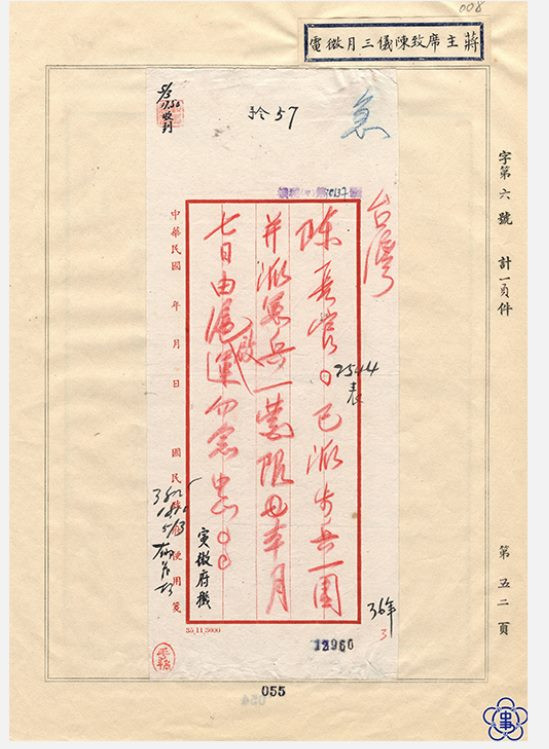 3月5日,蔣除了見到陳儀的「寅冬亥親電」外,尚有過去收於大溪檔案中陳儀所發的「寅支」電。寅支電3 月4 日18 時 25 分發出,電報末謂:「此次事情雖不日可望解決,但奸党禍根欲為拔除,不使其遺禍將來, 必須有相當兵力,俾資應用。前電〔按:即寅冬電〕所請酌調素質較好步兵一旅或一團來台, 仍請俯准照辦 」。該電,南京參軍處機要室的收到日期為3月5日凌晨1時,10時30分譯出。