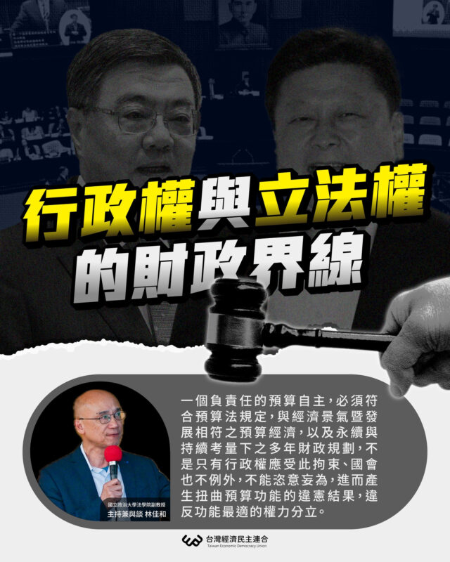為此,台灣經濟民主連合將於12/16(二)晚間舉辦座談會,就上述議題進行討論。開場將由賴中強律師進行報告,分析近年政府預決算的變化,並盤點本屆國會推動各項增加支出法律案之影響。座談會並邀請到林佳和副教授、柯格鐘教授、羅承宗教授等公法與財政領域學者,釐清行政權與立法權應有的財政分際,並嘗試為此重大憲政與財政爭議尋求解決之道。