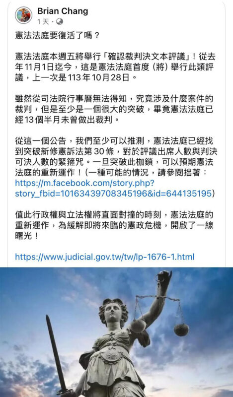 公民養成, 國家認同, 獨裁的進化與反撲, 當代台灣, 認識民主/民主防衛憲法法庭應不是臨時決定「復活」 Posted on 2025/12/182025/12/18 by 台灣放送 18 12 月 憲法法庭應不是臨時決定「復活」 陳錫平 似乎有不少人認為憲法法庭是看到或預測行政院院長(即將)不副署才突然活過來或醒來。但「確認裁判文本」評議,已是作成裁判前的最終評議階段。這絕非一蹴可及的審判進度,在這之前必然已經針對裁判重要問題與爭點及主文草案評議過了(還需要留時間給大法官寫個別意見書)。換言之,預定在本週五作成的裁判,應該是憲法法庭歷經相當時間審理、評議的成果。 (轉載自:Hsi-Ping Chen 2025/12/16 臉書貼文) 台灣放送 「台灣放送」是台灣民主防衛聯盟的網站,以推廣歷史知識、深化公民教育為宗旨,目的在提供國人較為周全的資訊,以了解台灣的過去,面對當代問題,為建立穩固、自由民主不退轉的國家備好道路。 守護樂生未來・行政院陳情行動/蔡瑞月文化基金會董事蕭世暉發言稿 旁人的苦難,我們的警惕