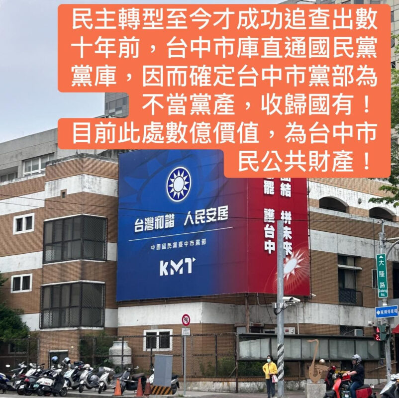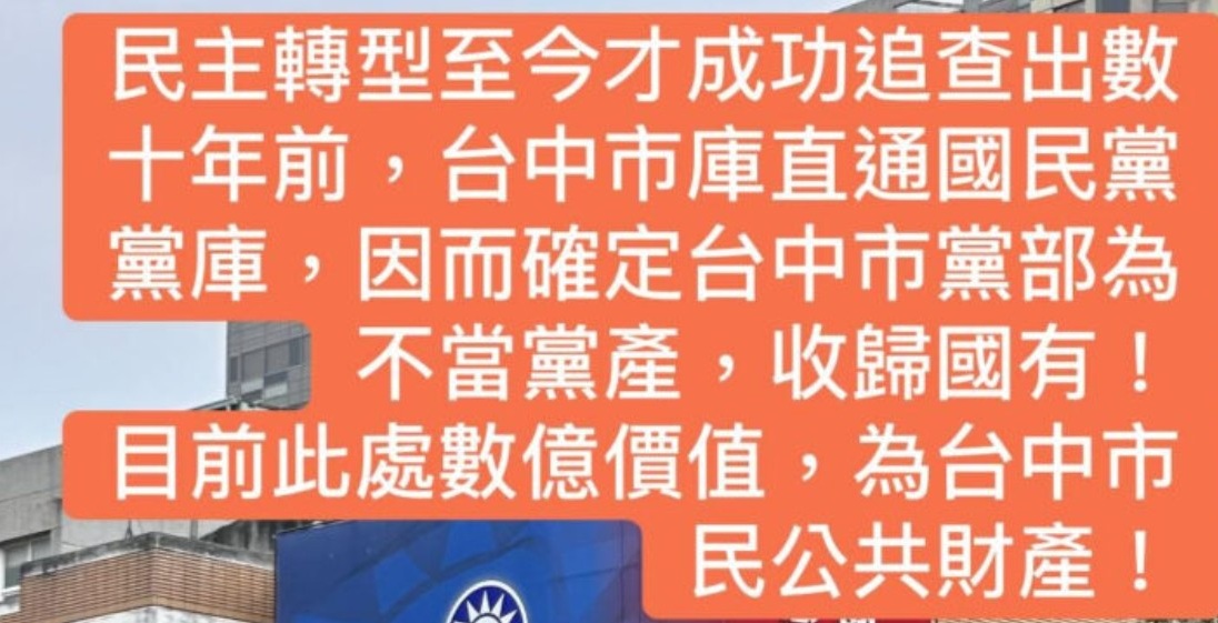 三、 借鏡台中經驗:「還產於民」不應被逆轉 我們已有成功的先例。過去中國國民黨不當取得的台中市黨部房地產(現址位於大隆路),在法律規範下已成功收歸公有,市值約 3 億元的資產目前已登記為台中市政府所有。這證明了「還產於民」是可行且正義的制度,而非口號。一旦此次惡法通過,未來所有類似的公共資產回流程序都將被終止。試問,從台中市民獲得遲來的正義來看,難道還產於民仍執意要煞停?黨產、國產難道至今不願分清?