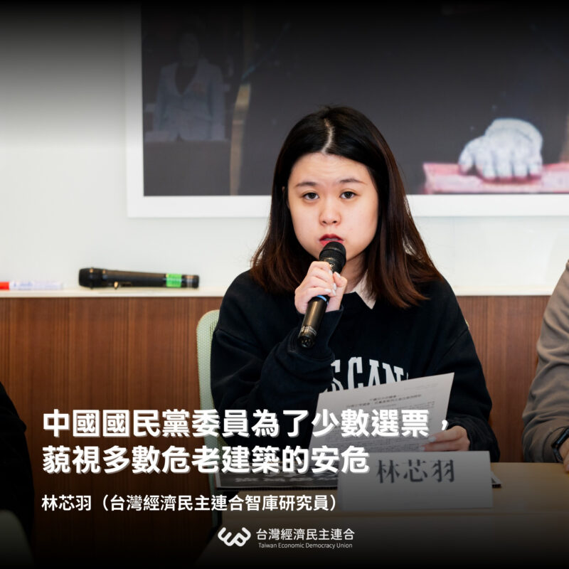 ​林芯羽表示:根據內政部2024年統計,全台危老建築將突破500萬戶,中國國民黨委員為了少數的選票,藐視多數危老建築的安危,只想要選票,忽視居住在危老建築居民的生命安全。