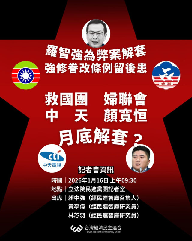 羅智強為弊案解套,強修眷改條例留後患/救國團、婦聯會、中天、顏寬恒月底解套?經民連1月16日上午記者會採訪通知