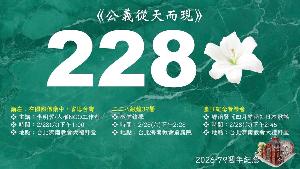 今年二二八事件79週年,當日下午2點28分,教會鐘樓將敲鐘39響,以記念事件的受害者。39響的鐘聲,是代表耶穌基督在被釘上十架前,遭羅馬政府兵丁鞭打39下,每次的鞭打,是代表上帝為世人痛苦所受的鞭打,意謂鞭打的39響鐘聲也是提醒社會,從二二八事件、白色恐怖再到今天,我們仍然要秉持信仰精神與受苦的人同受苦。歡迎參加本教會紀念活動。