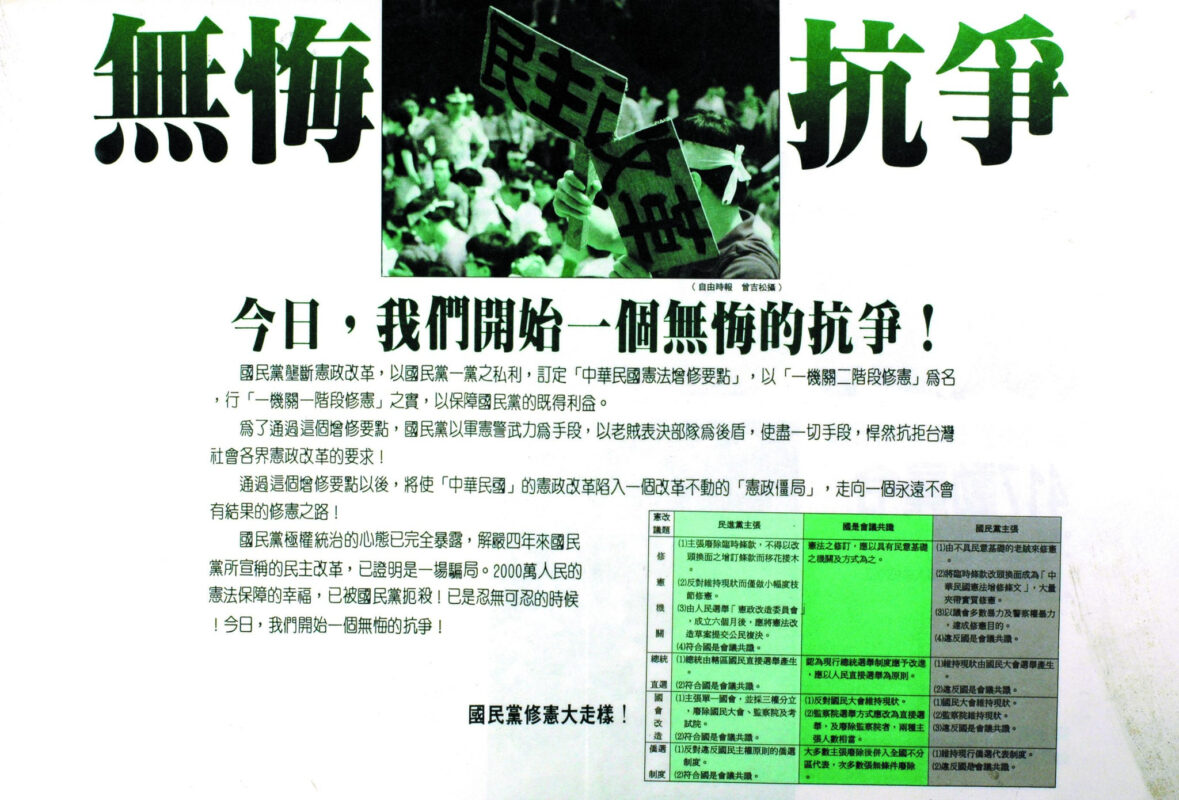 在修憲的同時,國民黨運用軍憲警等的「體制暴力」,在國會殿堂內對付民進黨國會議員,在街頭對付上街的學生、教授與人民,悍然抗拒台灣社會各界對憲政改革的要求。
