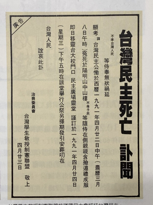 4月23日,制憲聯盟在台大門口搭建靈堂,供奉「台灣民主英魂」,發表「台灣民主死亡訃聞」,把台大校門口搞得像在辦國喪,施明德先生加入學生絕食的行列。