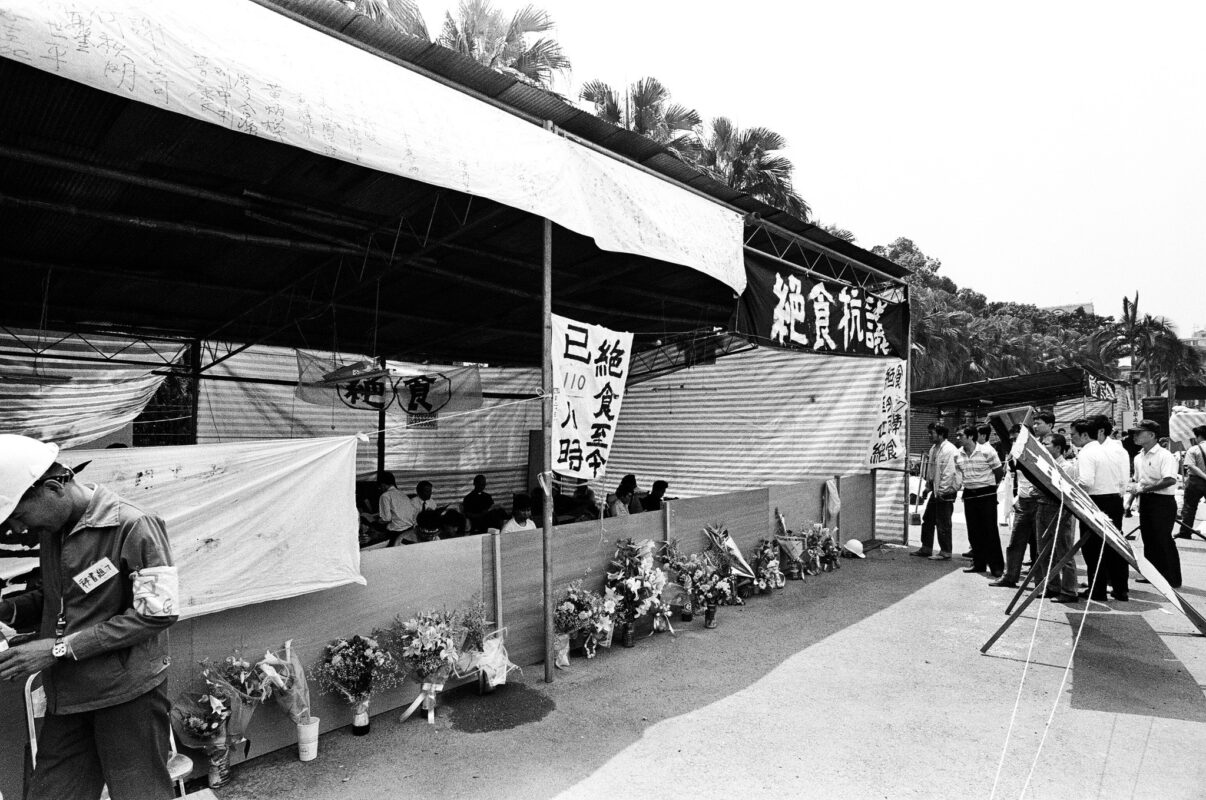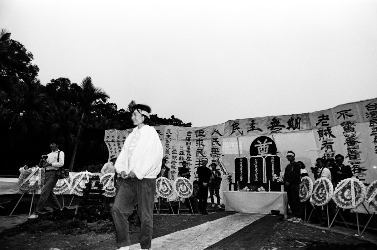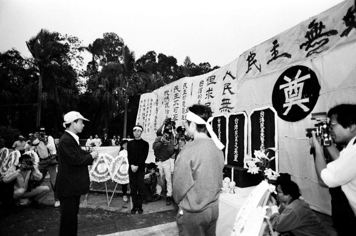 1991年4月23日,制憲聯盟在台大門口搭建靈堂,供奉「台灣民主英魂」,民進黨主席帶領黨公職來祭拜。