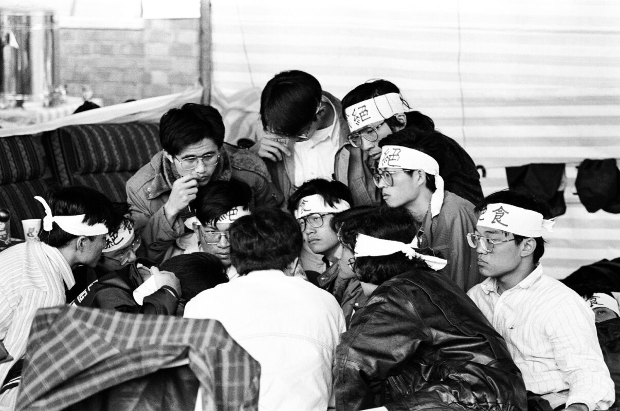 1991年4月18日,鄭麗君和九位學生在台灣大學門口,為了抗議山中老賊參與修憲,發起一場激烈絕食運動。攝影/邱萬興