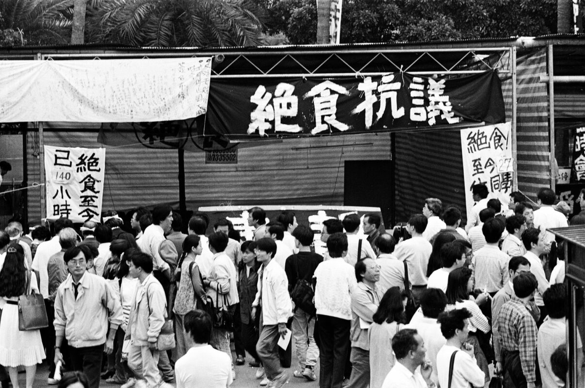 1991年4月18日,學生在台大門口,發起一場激烈絕食運動。