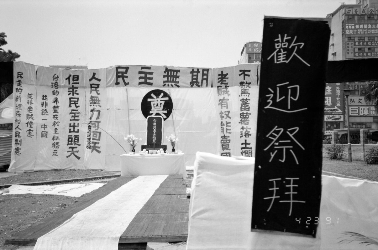 1991年4月23日,制憲聯盟在台大門口搭建靈堂,供奉「台灣民主英魂」,歡迎民眾來祭拜。