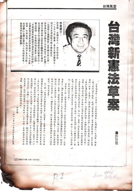 1988 年12月10日國際人權日,《自由時代週刊》刊登了台灣獨立建國聯盟許世楷博士所撰寫的《台灣共和國憲法草案》,12月底,便因該草案主張分裂國土而遭查禁;鄭南榕刊登這篇文章,引起國民黨強烈的震撼,國安局便指示法務部要法辦鄭南榕。
