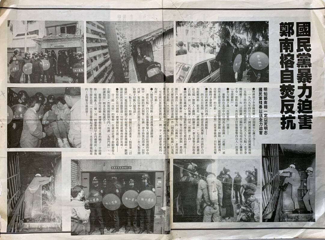 1989年4月7日,國民黨出動大批警力,由台北市中山分局刑事組長侯友宜帶霹靂小組重裝攻堅。鄭南榕為了言論自由抵死不從,甘願自己活活燒死,以身殉道,這把火也照亮了台灣的自由與人權。
