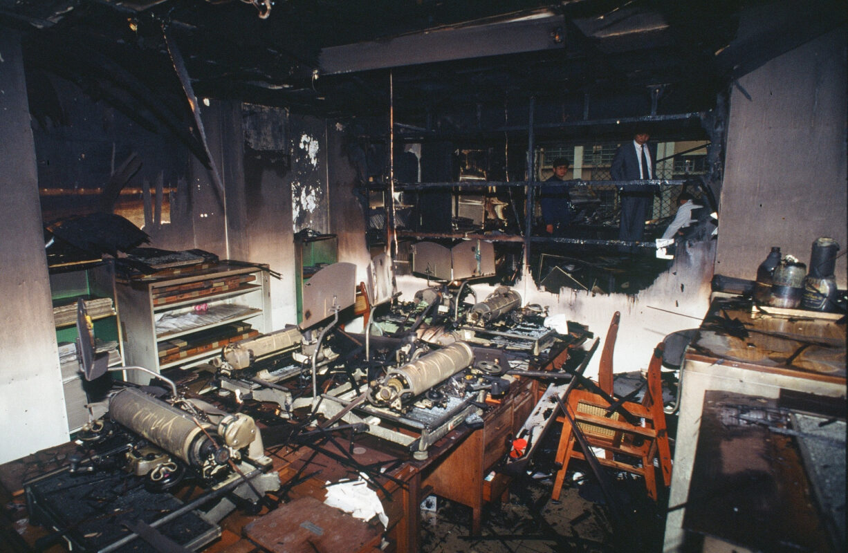 老實說,我和民進黨創黨主席江鵬堅第一個進入《自由時代》雜誌社拍照記錄,看見總編輯室一具挺直振臂焦黑的身體,那一幕的畫面很難忘。37年過去了,那是一段刻骨銘心的記憶,邊拍邊掉眼淚,也是我一生中最難過的一次攝影記錄。
