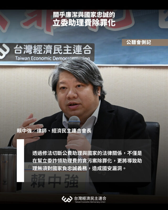 賴中強最後提出最嚴肅的警告:該草案將斬斷公費助理與國家、立法院的法律連結。這意味著,領取國家公帑的公費助理,未來將只對「立委個人」負責,而無須對「國家」負忠誠義務與保密義務。
