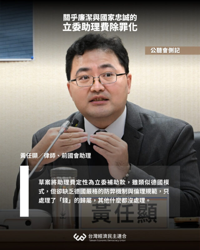 針對社會最關注的貪污問題,黃任顯強調,若依此草案通過,像顏寬恒這類的詐領助理費案件,極可能因款項性質的轉變而無法被定罪。在德國,亂搞補助款會有巨額罰款作為威嚇,但台灣這份草案只處理了「錢給誰」的問題,卻完全沒有相對應的懲處機制。他呼籲,在建立完整的國會倫理規範與治理機制之前,單純更動經費性質,這是這次修法應特別注意的地方。