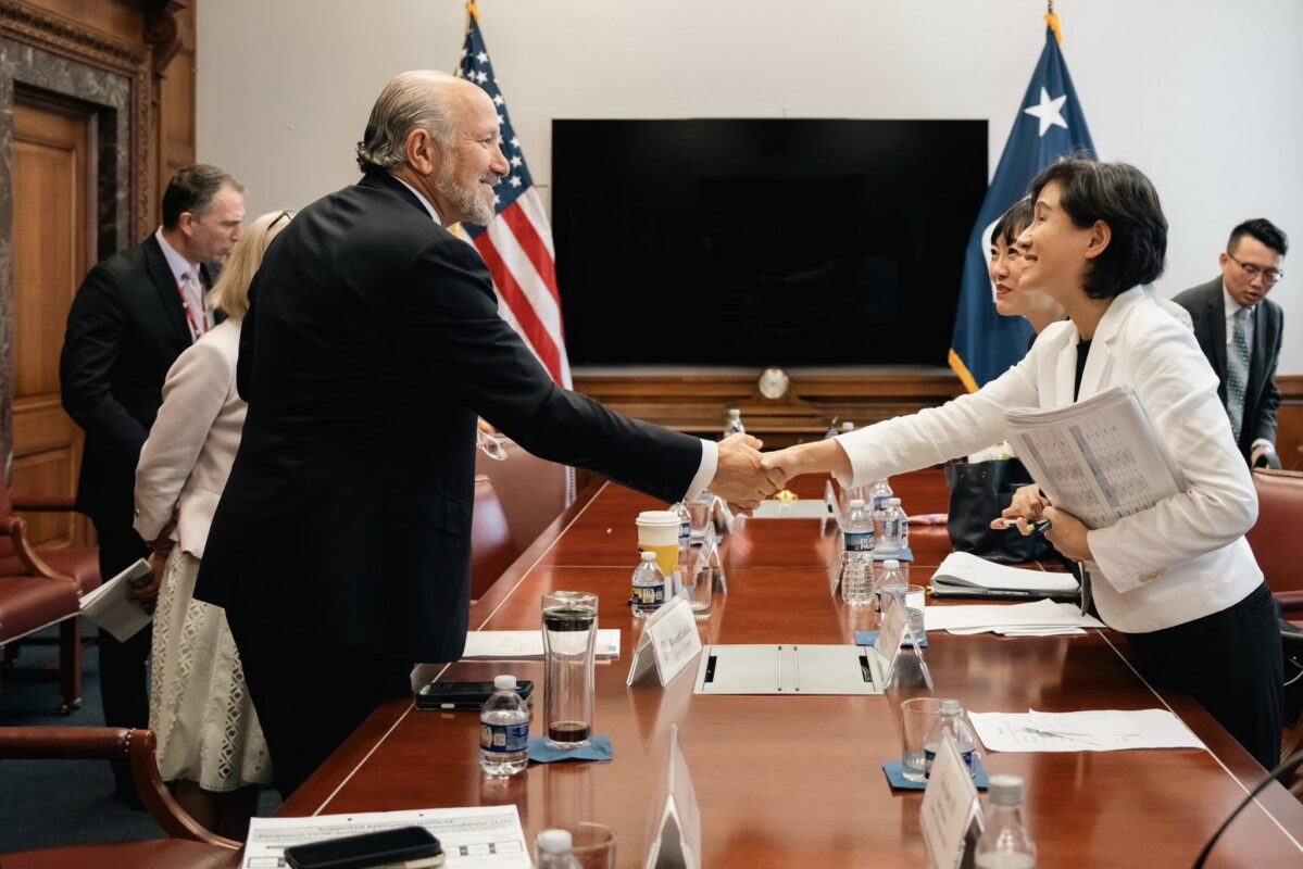 照片取自鄭麗君 2026/1/19 臉書。原說明:圖說 (4) 美東時間2025年9月29日,於第五輪臺美實體磋商期間,再度率團赴美國商務部與盧特尼克(Howard Lutnick)部長等舉行雙邊會議,與部長進入會議室後先行握手致意。
