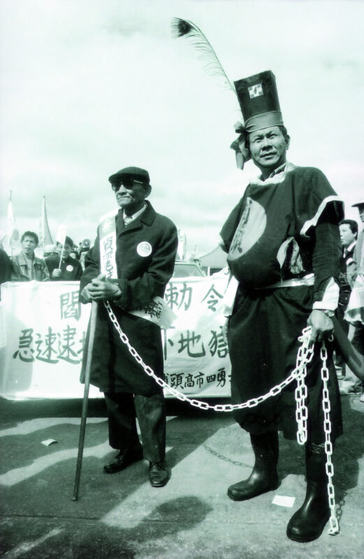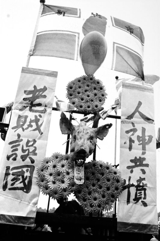 1989年1月29日,兵分三路反老賊運動,出現在遊行中出現的老賊布偶,也是我請同學幫忙製作,花了很多時間製作出來的老賊道具。那些年,很多街頭的文宣巧思紛紛出籠,我負責反老賊抗爭文宣傳單,也幫文宣部想了一個反老賊遊行道具的創意大賽。