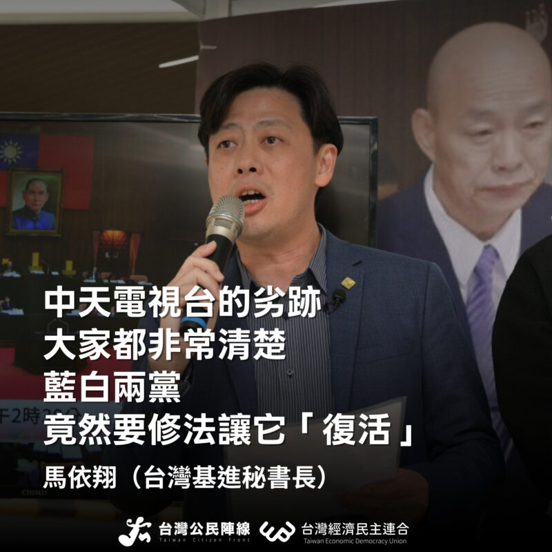 為應對立法院藍白黨人的「法案大清倉」,台灣經濟民主連合與台灣公民陣線今召開「抗議立法院成為違法特權者的解套院,反對為救國團、婦聯會、中天、顏寬恒貪污案解套」系列記者會。本新聞稿為今日第二場記者會【抗議《衛廣法》修法-毀棄專業把關 中天紅媒回歸】之新聞稿。