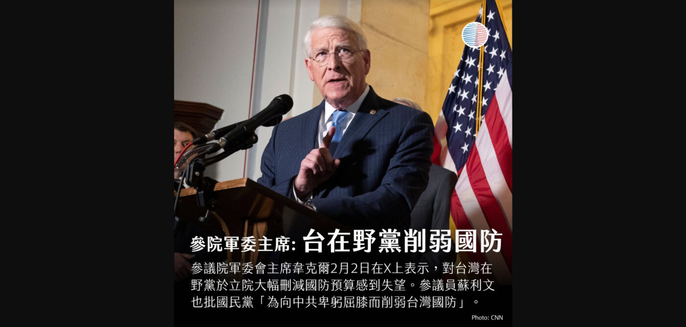 美國參議院軍委會主席韋克爾(Roger Wicker)2月2日在推特(X)上表示,對台灣在野黨於立院大幅刪減國防預算感到失望。他說:I’m disappointed to see Taiwan’s opposition parties in parliament slash President Lai’s defense budget so dramatically.