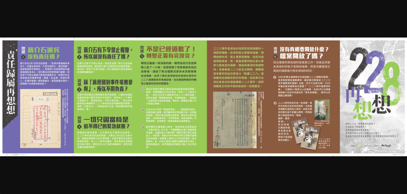 二二八距今已經77年,或許你曾在課本讀到過相關介紹,但對許多人來說仍然是陌生且遙遠的歷史事件。為了推廣對二二八事件的認識,二二八事件紀念基金會特別製作了「228再想想」摺頁文宣,整理對於二二八的常見質疑與誤解,希望讓大眾可以有更深入的理解。