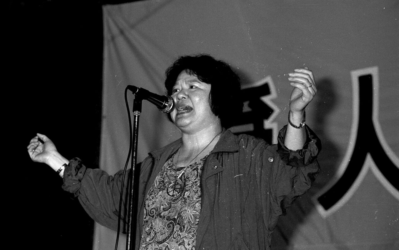 1990年12月10日,台大研究生協會在台大門口舉辦「為人權而唱 與人民站在一起,唱人民的歌」,葉菊蘭演唱客家歌曲〈天空落水〉。攝影/邱萬興