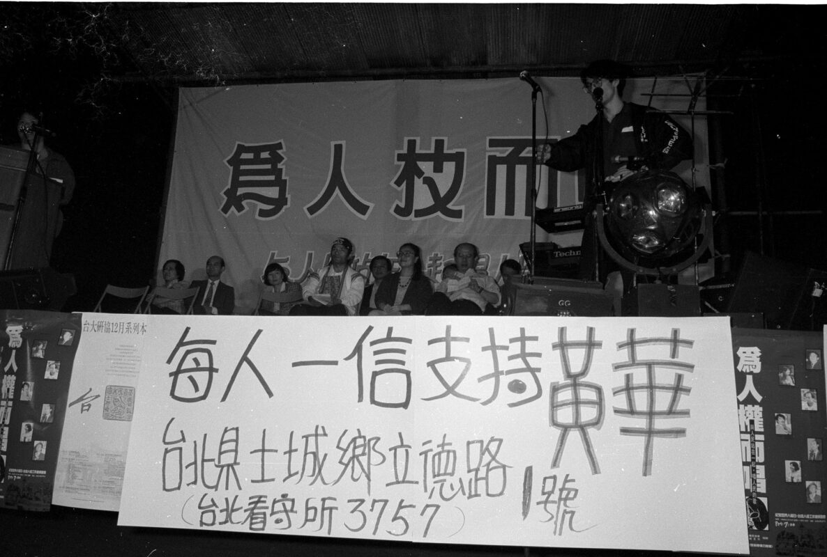 1990年12月10日,台大研究生協會在台大門口舉辦「為人權而唱 與人民站在一起,唱人民的歌」,朱約信主持這場演唱會,我幫忙寫上海報一人一信救援黃華。攝影/邱萬興