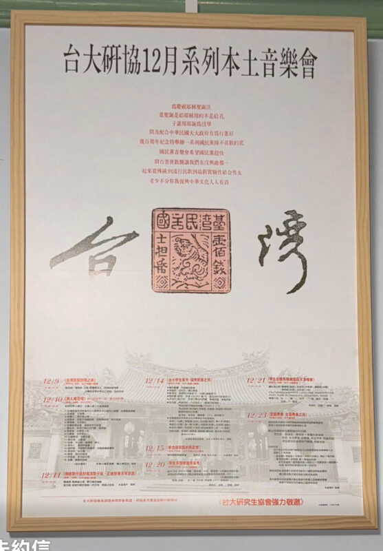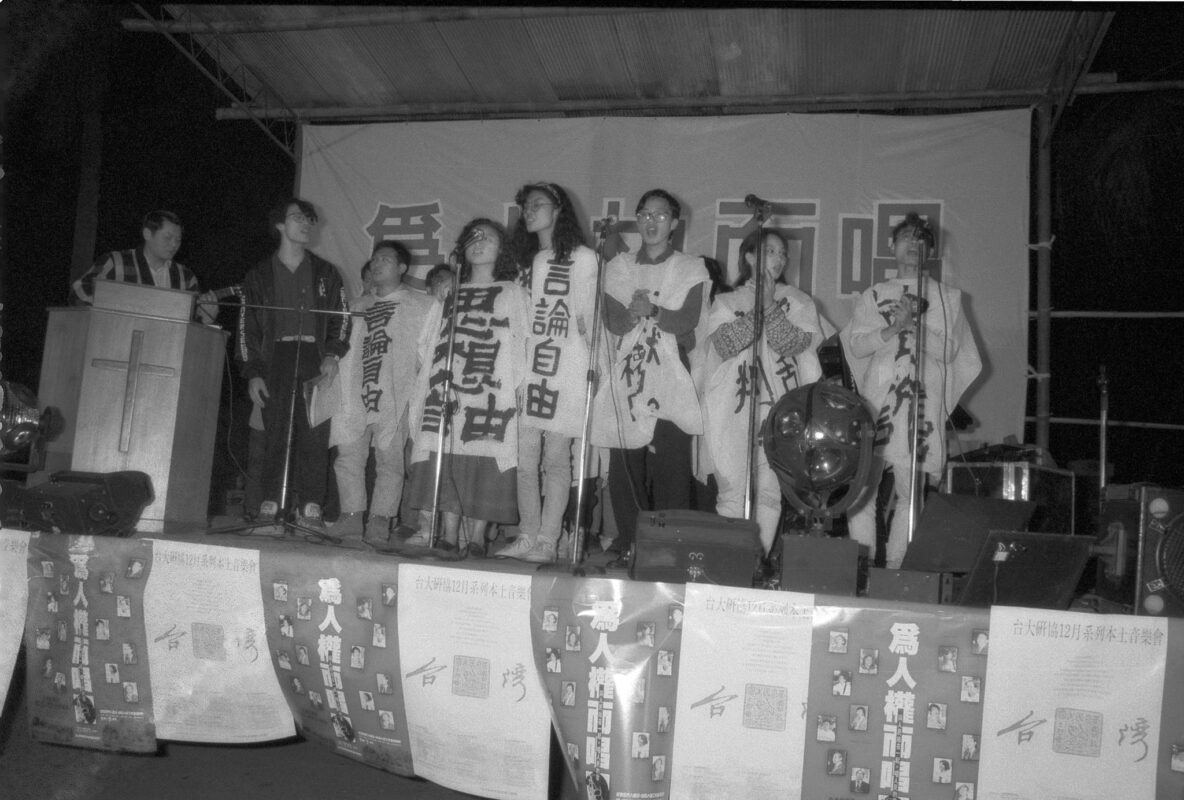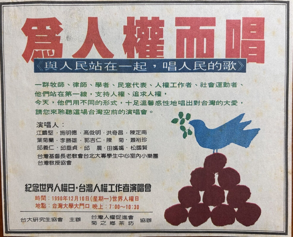 1990年12月10日,台大研究生協會在台大門口舉辦「為人權而唱 與人民站在一起,唱人民的歌」。台大研究生12月本土音樂會海報。