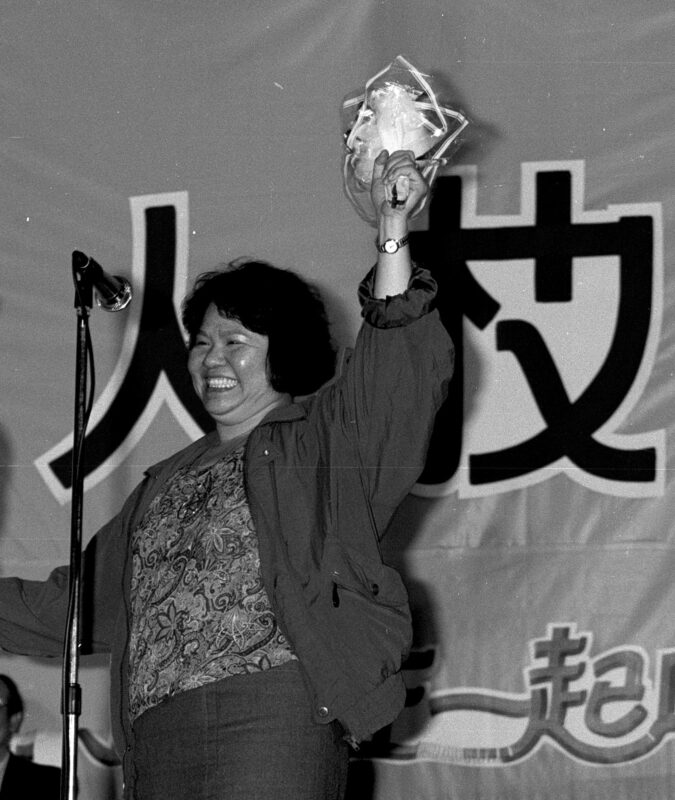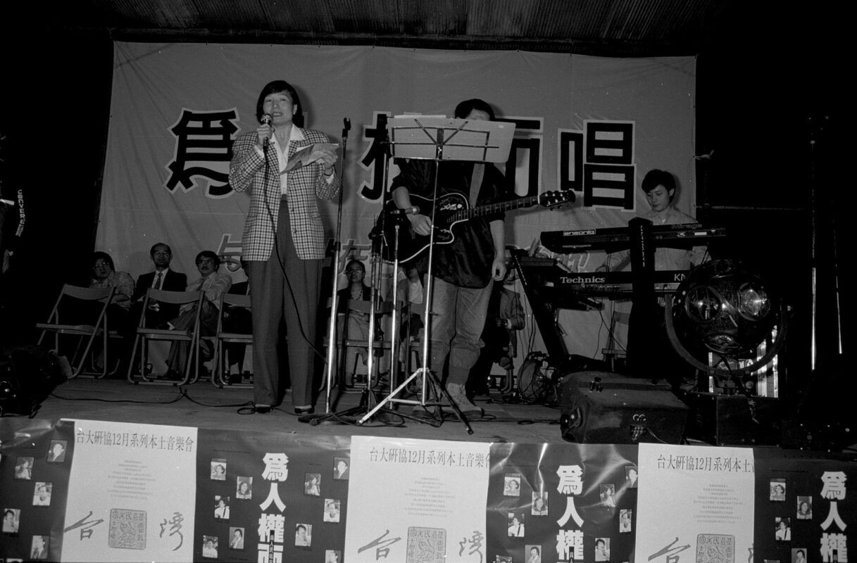 1990年12月10日,台大研究生協會在台大門口舉辦「為人權而唱 與人民站在一起,唱人民的歌」,陳菊第一次在公開場合演唱〈孤女的願望〉。攝影/邱萬興
