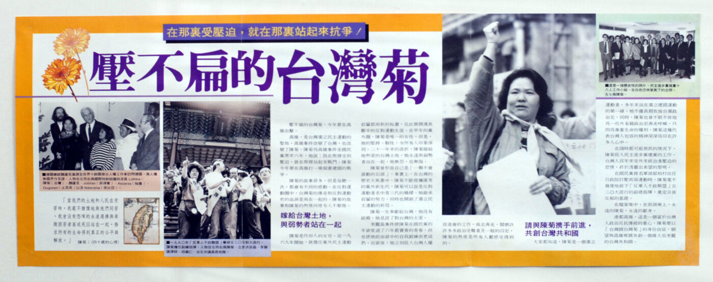 1991年陳菊在高雄市參選國代,以壓不扁的台灣菊高票當選,我提供當時的所有街頭運動照片給陳菊製作文宣。