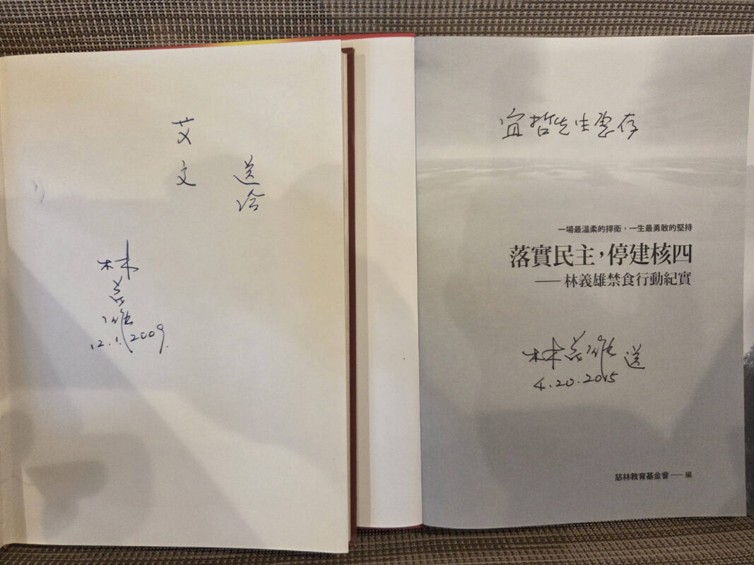 一直覺得林義雄夫婦對台灣人有重要意義,所以之前製作完成的專輯,會在第一時間寄到慈林基金會,同時附上一張有電話號碼的小紙卡。從來沒有意外,我總會在最短時間接到他們的鼓勵電話,也曾因此收到林先生簽名書這樣的珍貴回禮。面對不認識的後生小輩,這麼周到這麼溫暖,這就是林義雄夫婦。