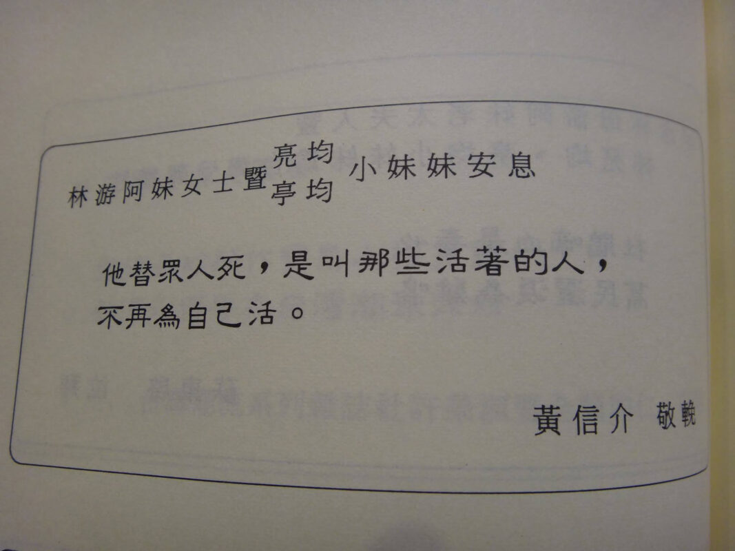 在林宅血案十周年紀念文集中包括輓聯弔詞選編,民主前輩黃信介給林家受難祖孫三人的輓聯上,寫著來自聖經哥林多後書五章十五節的一段文字:「他替眾人死,是叫那些活著的人,不再為自己活。」
