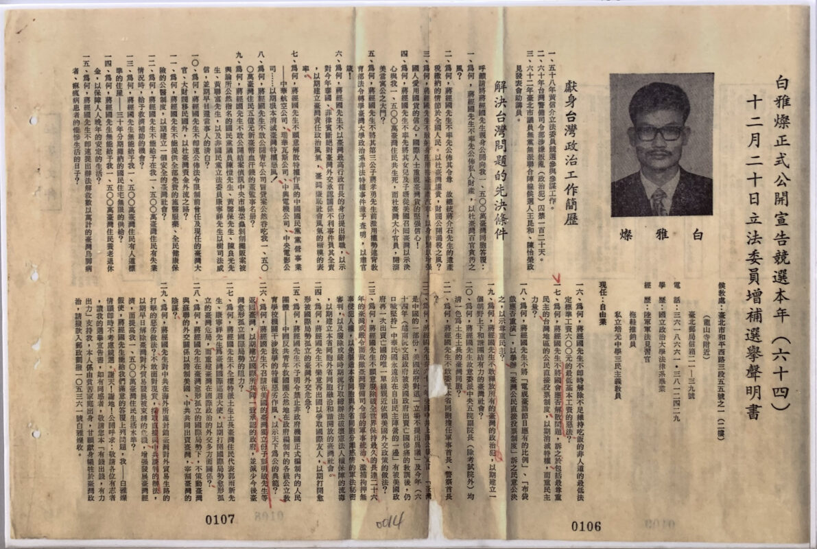 1975年白雅燦在立委競選期間,為了打開自己參選知名度,他印製一張政見傳單,向蔣介石(當時剛過世)的長子——行政院長蔣經國提出29個問題。