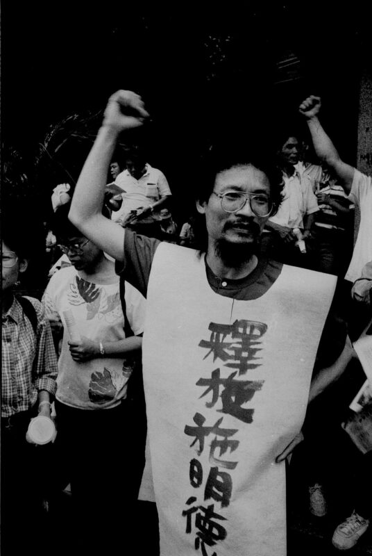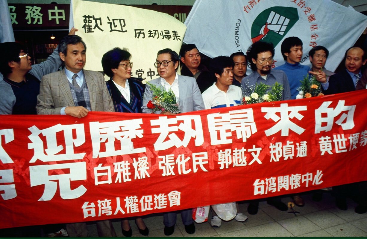 1988年4月22日,白雅燦、張化民、郭越文、黃世梗、鄭貞通等政治犯從綠島歸來,我們做歡迎布條去台北松山機場接機,歡迎火燒島的政治受難者歸來。
