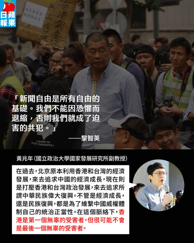 我們知道,香港《蘋果日報》在運作期間曾充滿爭議,但是它也撐出非常巨大的言論自由空間,如今它被中共徹底抹煞,用羅織罪名、莫須有的方式,打壓一間報社的老闆以及新聞從業人員。港府對黎智英的監禁,是對全香港言論自由的掩埋。