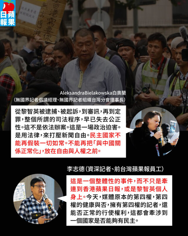 社會各界普遍認為,對於健康狀況不佳的黎智英而言,事實上根本等同死刑。這不只是對黎智英個人的宣判,也是對香港言論自由的宣判。我們不可能無視黎智英與《蘋果日報》為香港言論自由奮鬥超過三十年的歷程。