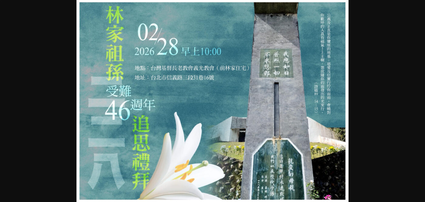 本會佇2026/2/28(六)早起10:00舉行林家祖孫受難四十六週年追思禮拜,地點佇本會禮拜堂,邀請兄姊參與及關懷。