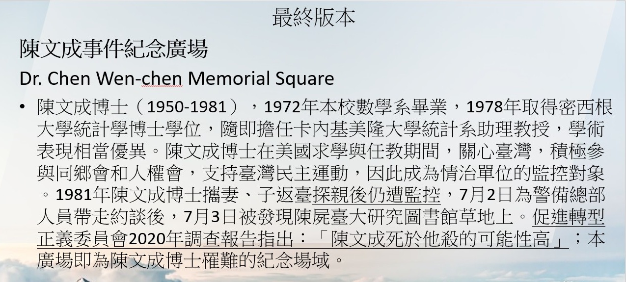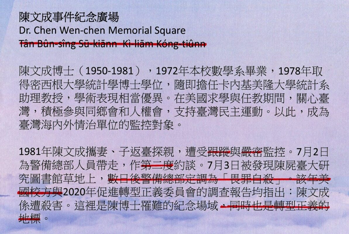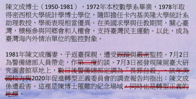 陳文成事件紀念廣場是台大學生+民團+教師+民間支持者努力十年才爭取到的。但紀念廣場的說明牌不准寫:1、台羅。2、警總定調「畏罪自殺」。3、美國母校調查。4、轉型正義四個字。還有其他,請你自己看圖二。這是當時的校長不准寫,你說他們不是主流,是什麼?