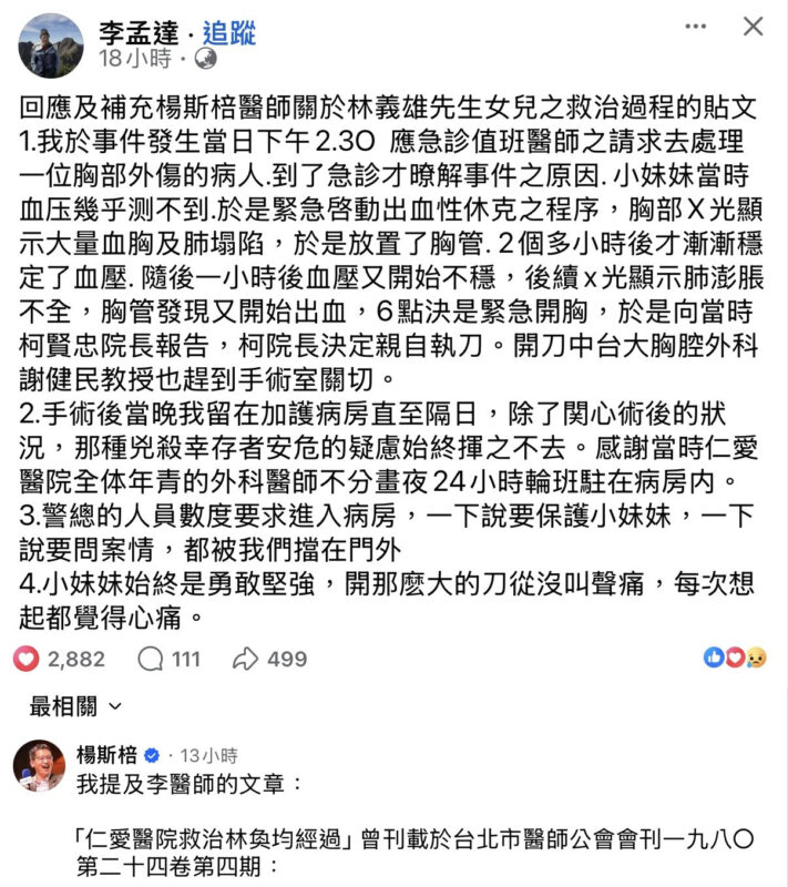 「回應及補充楊斯棓醫師關於林義雄先生女兒之救治過程的貼文