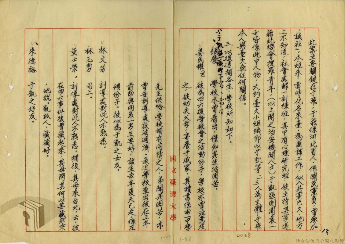 從傅斯年的函件,可以看出幾件事。第一,傅斯年不但寫信給林秀欒,而且曾親自和他談論案件。第二,傅斯年會挑出張老師,表示可疑,是因為校方本來就認為張老師有問題,案發前台大訓導長鄭通和(西谷)已經主動向警備總部告發張老師。