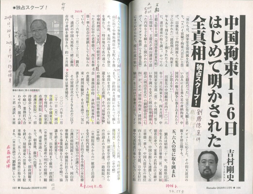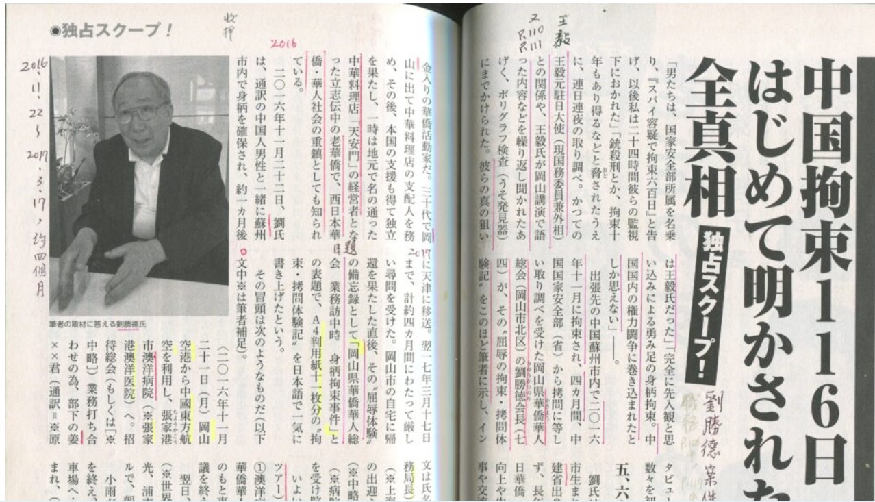 以下根據記者吉村剛史的記載介紹在日華僑「劉勝德事件」,他被設計赴中國的醫院商洽醫療合作業務,以「間諜嫌疑」被拘禁116天,即自2016年11月22日到2017年3月17日,約四個月。被釋放回日本後以A4大小的紙張寫了11張稿,題目「岡山縣華僑華人總會業務訪中時被刑拘事件」(暫譯)。
