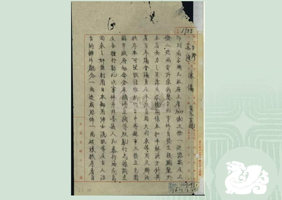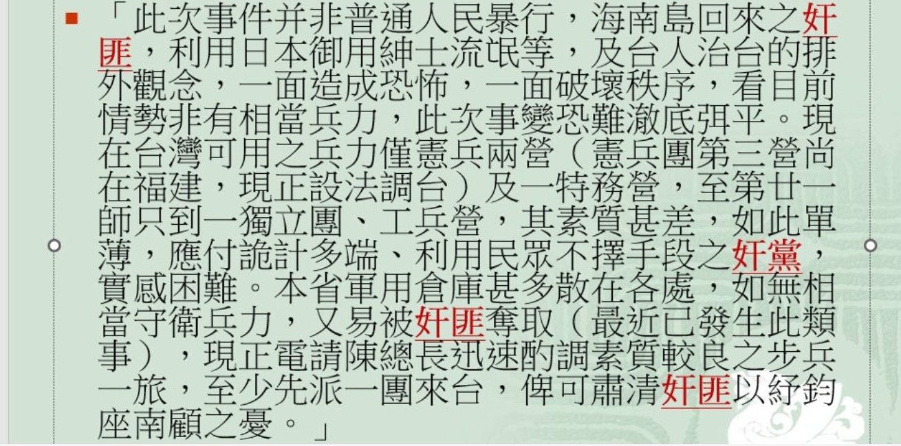 79年前的昨天(3/2):3月2日「二二八事件處理委員會」(處委會)第一次開會,這是前一天在陳儀同意緝菸血案調查委員會的要求,由官民共同組成處理委員會。處委會開會時陳儀指派長官公署民政、警務、交通等官員來參加,你說台灣人是不是太「古意」?也就在這天(3/2)陳儀一面和處委會「周旋」,一面發電報(寅冬亥親電)向蔣介石請兵。兩頁的電文用了三次「奸匪」,一次「奸黨」!