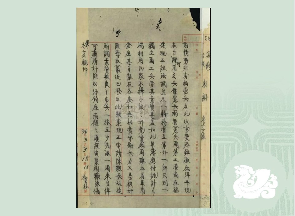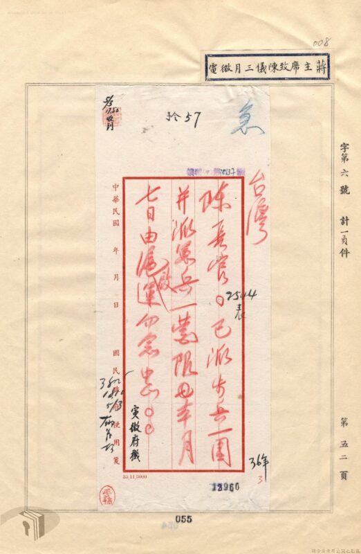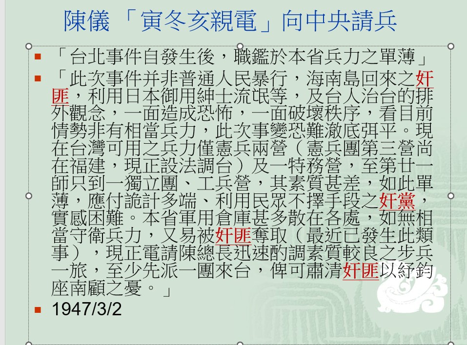 3月5日蔣介石同時看到這兩封請兵電文,同日就下手令回應陳儀的請求,請陳儀「勿念」。手令寫限軍隊3月7日從上海啟航〔開來台灣〕。